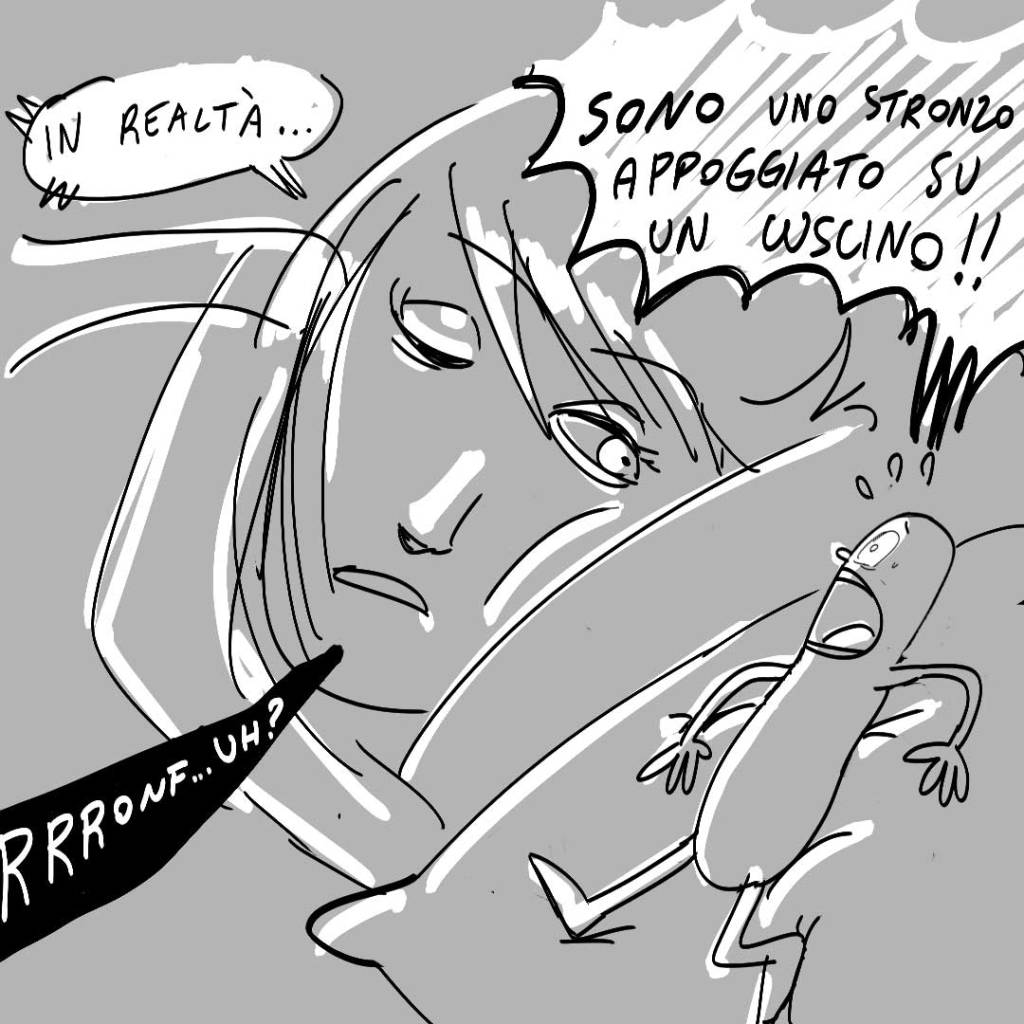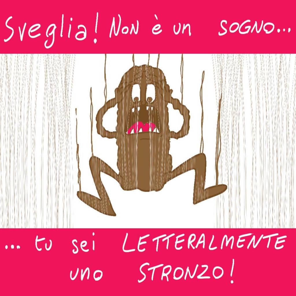 2. Seconda vignetta: Qui arriva la rivelazione ironica: il personaggio viene brutalmente svegliato con la frase “Sveglia! Non è un sogno, tu sei letteralmente uno stronzo!”. Questa scena aggiunge un colpo di scena comico e grottesco, giocando sull’elemento scatologico come simbolo di auto-svalutazione o consapevolezza di una condizione di degrado.