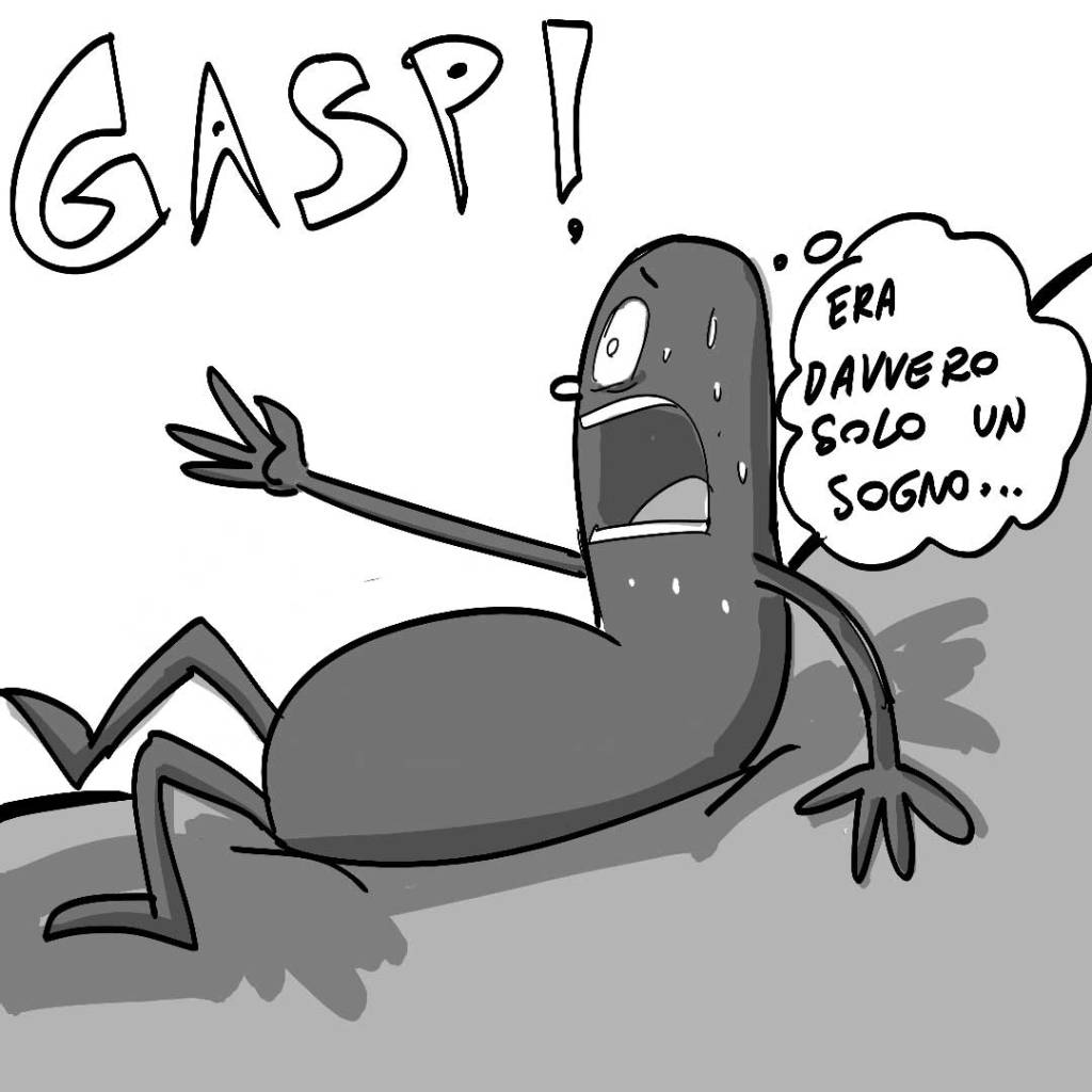 7. Settima vignetta: Un personaggio stilizzato si sveglia con espressione terrorizzata, scoprendo che era solo un sogno. Questo topos di “gasp” dopo un incubo rimanda a una classica narrativa onirica dove la confusione tra realtà e sogno diventa centrale.